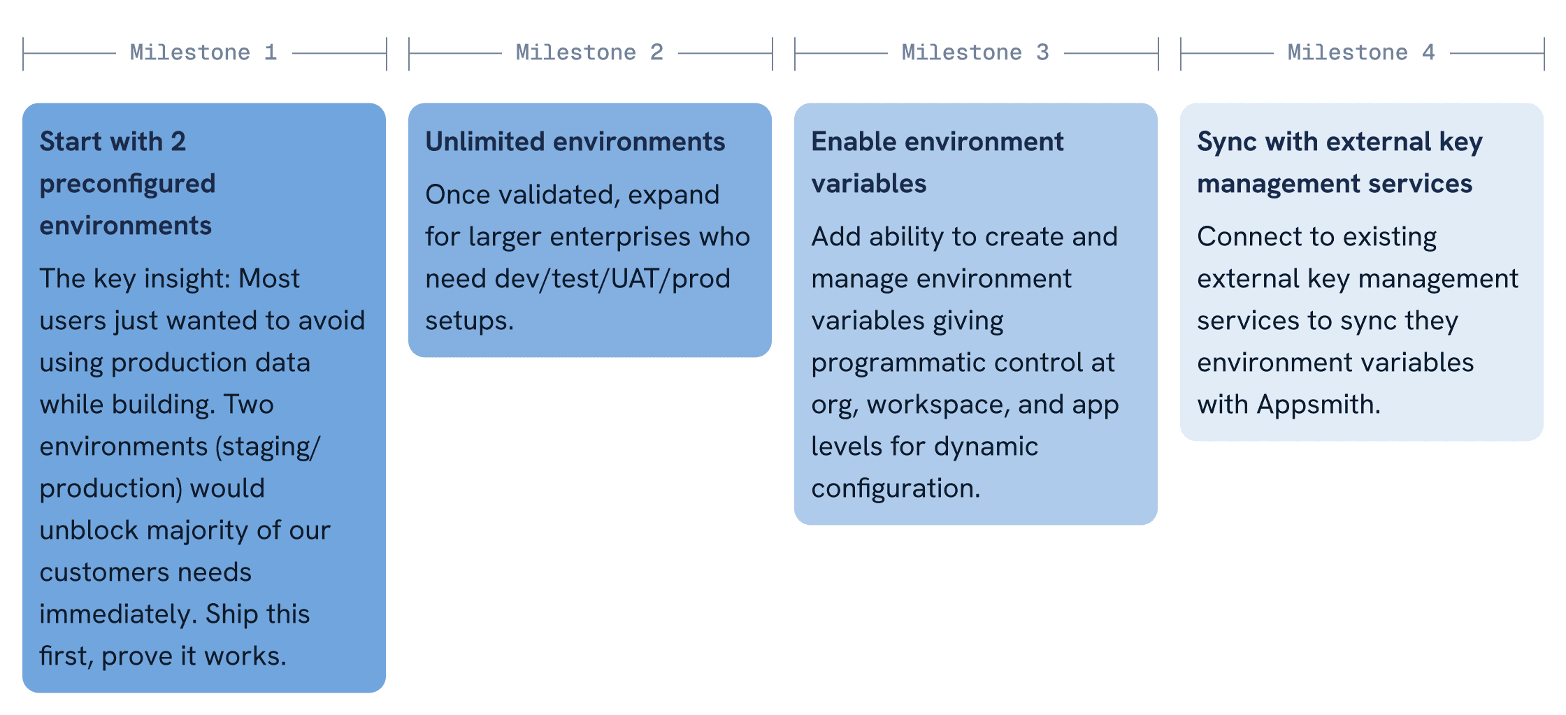 Each milestone de-risked the next. If users didn't adopt milestone 1, we'd pivot without wasting quarters on the wrong solution. But if they did, we'd have confidence to build further.